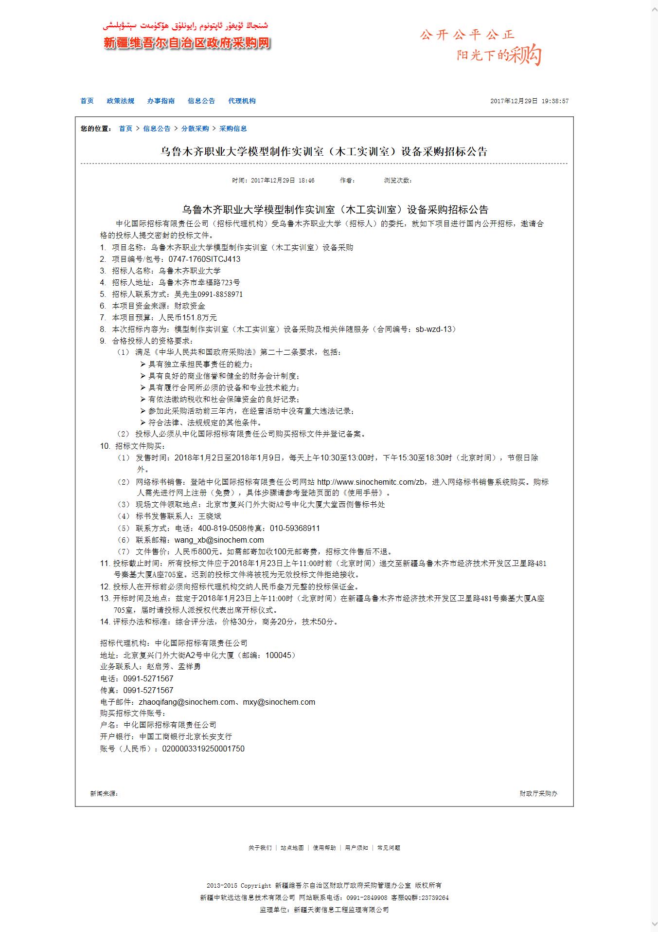 乌鲁木齐职业大学模型制作实训室(木工实训室)设备采购招标公告