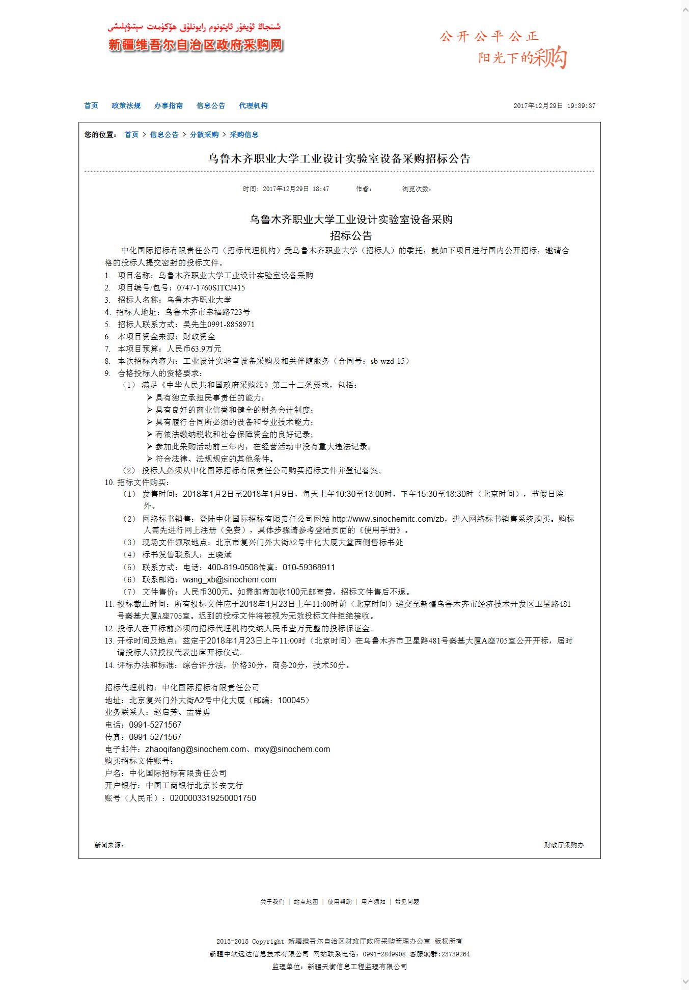 乌鲁木齐职业大学工业设计实验室设备采购招标公告