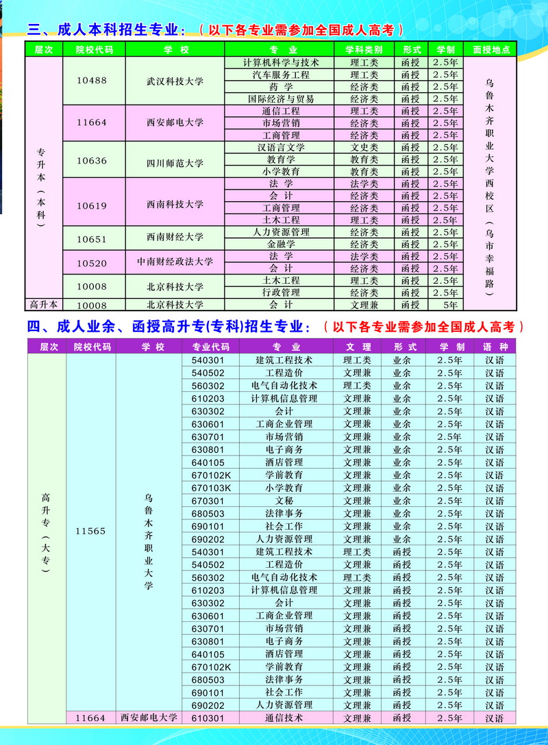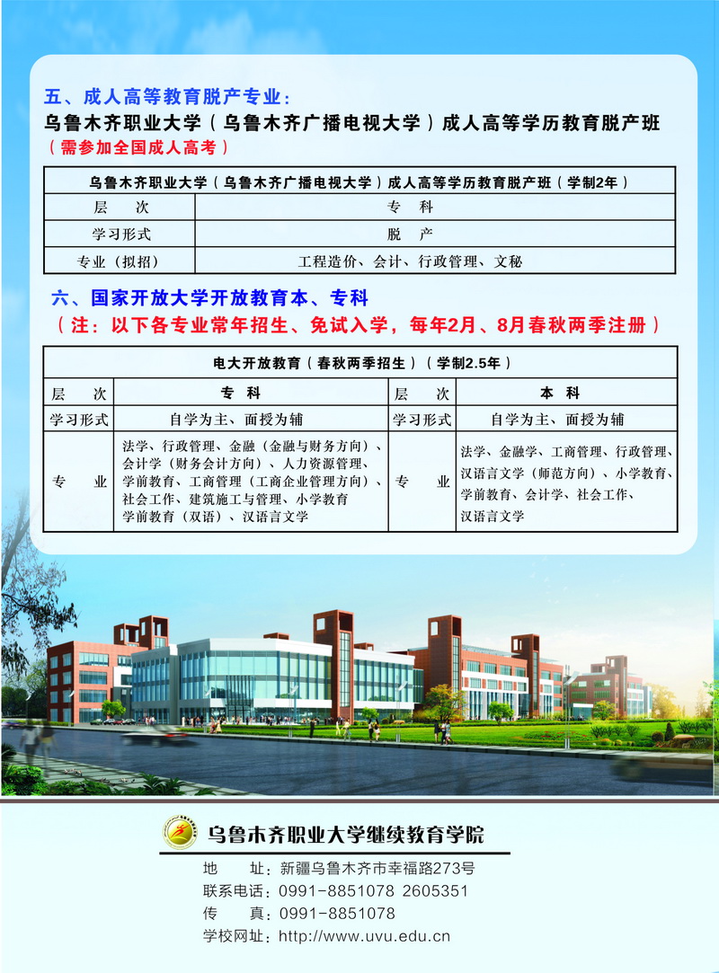 乌鲁木齐职业大学2017年成人教育招生简章
